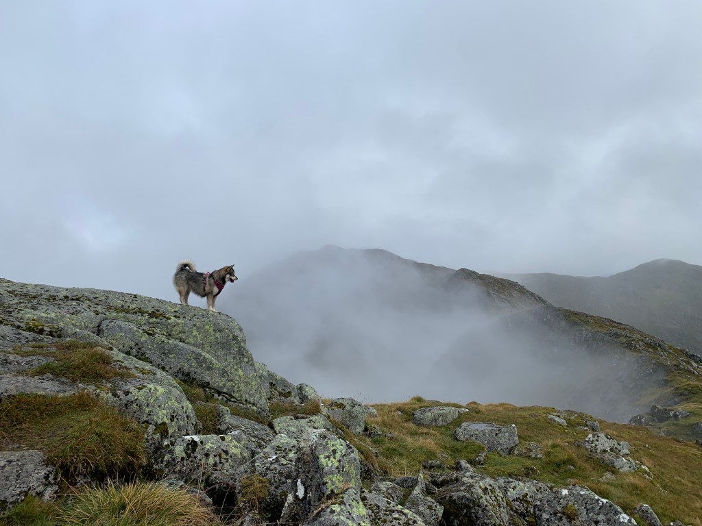 I ran into to some fellow hikers Fiona and Katie, and Katie’s dog Misty – a pomsky! – and joined them from Ben Cruachan onwards. Fiona and Katie were great company and Misty was in her element trotting ahead picking out the path, and posing in choice places for photos, such as: