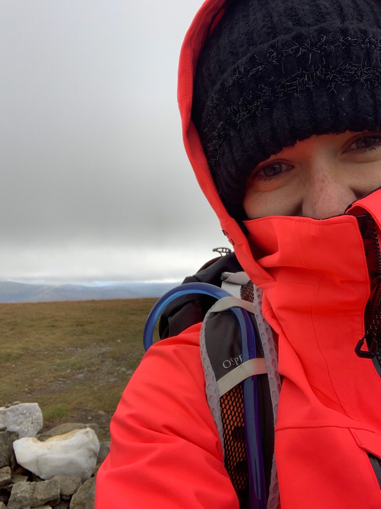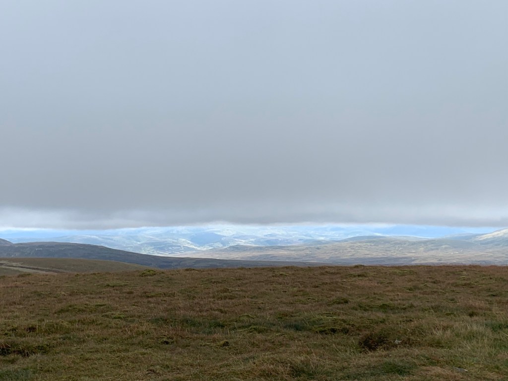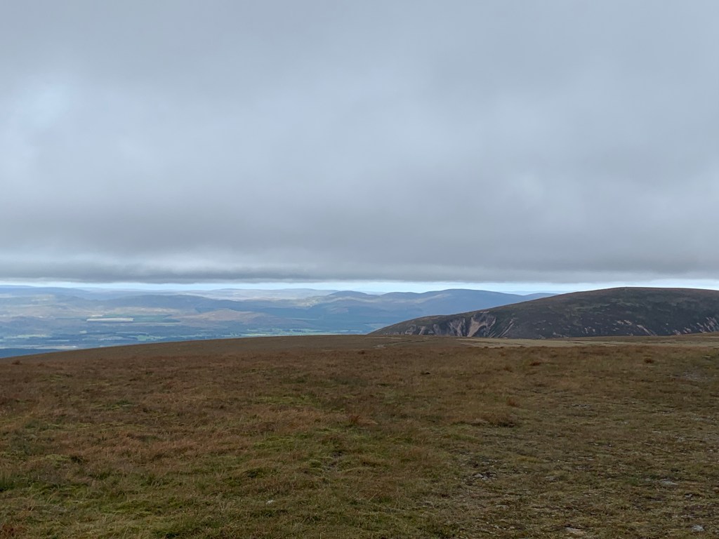Mullach Clach a’Bhlair itself is a rounded hill, a bit non-descript, but with a very windy top! I’m not sure what the actual wind speed was, but this was the type that takes the air from in front of your face right as you try to breathe it. It very nearly took the hat off my head. The cloud was also hanging so low it seemed like I could almost touch it. And I was looking at a view through a letterbox.