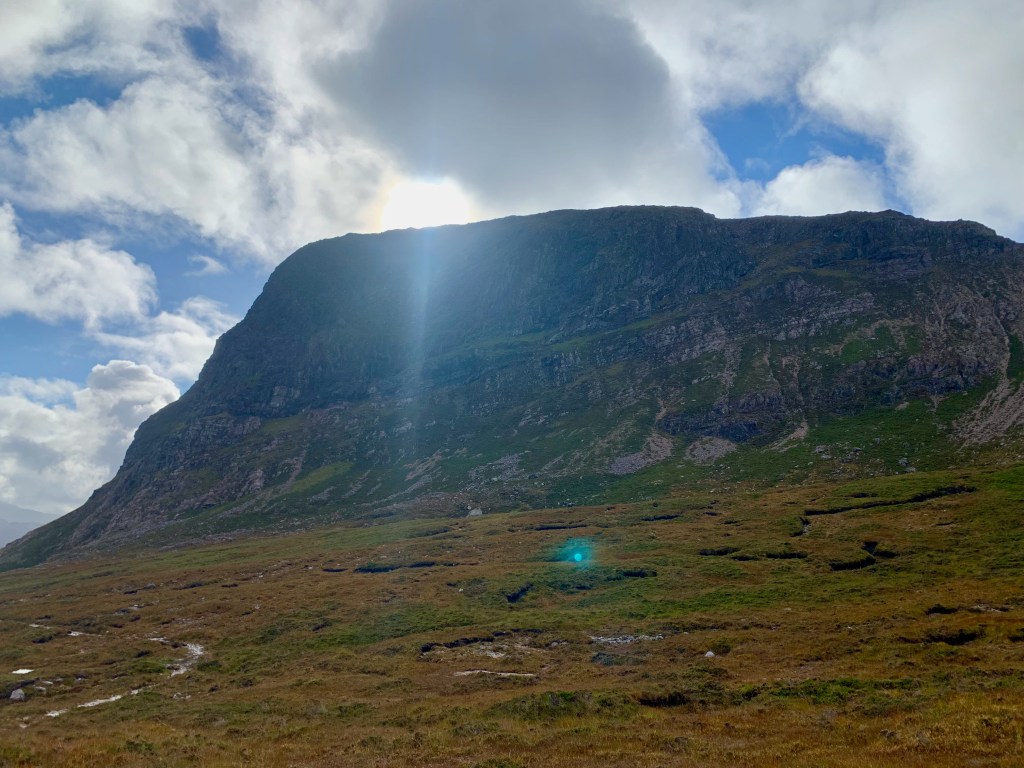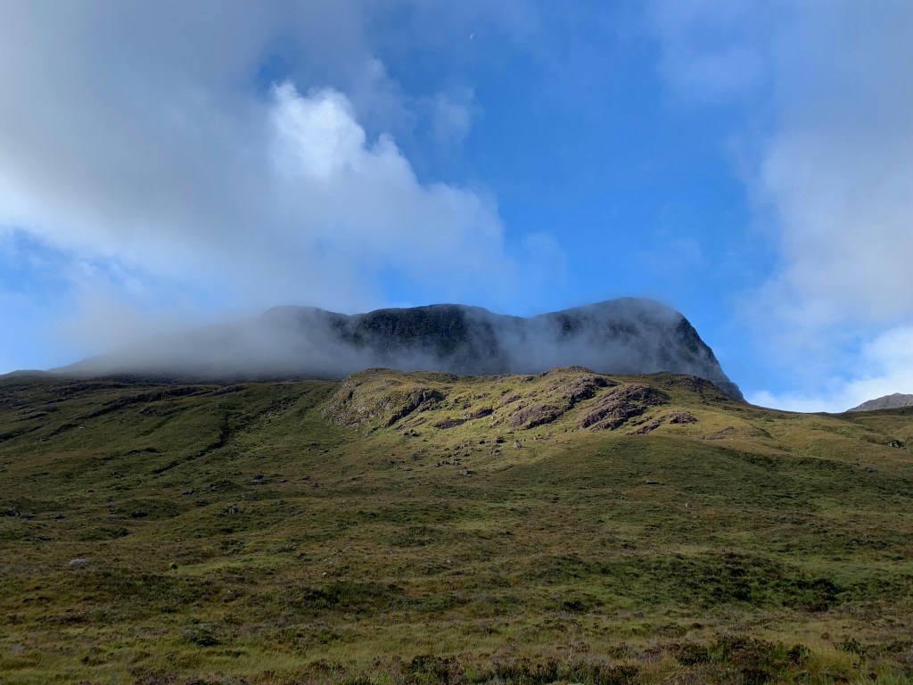 And the forecast looked good! The walk through the glen to the hill was wrapped in lovely sunshine broken with fluffy clouds sailing around, and the surrounding hills were food for the eyes. There was an eagle circling the top of Meall nan Ceapairean (a smaller hill) which I was walking around. My brain could not compute the enormous breadth of its wingspan – I was too dumbstruck to get a photo. Please use your imagination to paste a picture of a Golden Eagle in flight near the top of the hill in this pic. Hopefully it won’t be the last one I see.