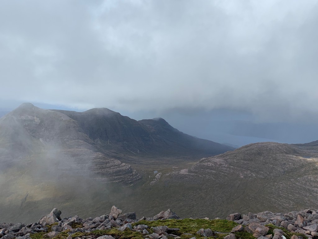We gave up waiting for the mist to move on, and started to make our way back down the boulderfield. Just as we started the hop scotch down over the boulders…along came the rain and a spot of light hail! As if the mountain was saying “and stay ooot!!”. Of course once we were *just* far enough down the hill that I wouldn’t be going back up, we looked back and naturally the top was once again covered in sun and blue skies. Gaah. Trolled by the mountain. At least at a couple of points on the route down I got a distant glimpse of the hills of Torridon which I’d hoped to see from the top – a teaser for another day.