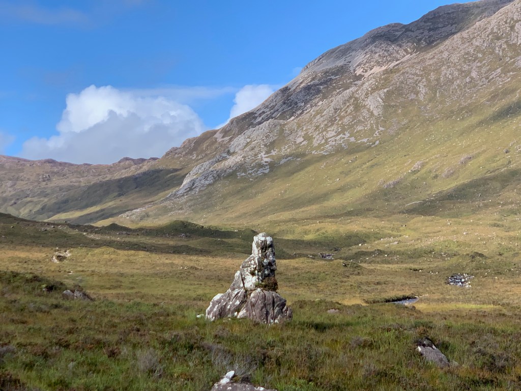 The route through the valley on this walk passes the Clach nan Con-fionn, which is a giant stone that looks like a fancy art installation belonging in a trendy wine bar. Legend has it the stone was used by the giant, Fionn, to tether his hunting dogs. I was impressed by this on the walk in. But on the walk out it looked more like the valley giving us the finger – clearly colluding with the weather!!