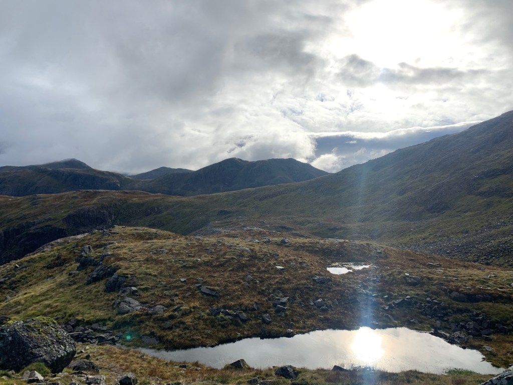 My route up was between two of the sisters – up the corrie in the left of the photo above. A steep path taking me up up alongside the noisy water on its way down. At the top of the corrie I headed left to pick up the ridge of Stob Coire nan Lochan – which is high enough to be a munro, but not distinct enough from Bidean nam Bian to be classed as a munro in its own right. There were some lovely lochans at the top of the corrie – which is called Coire nan Lochan after all – which the light was catching beautifully.
