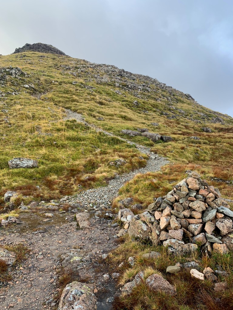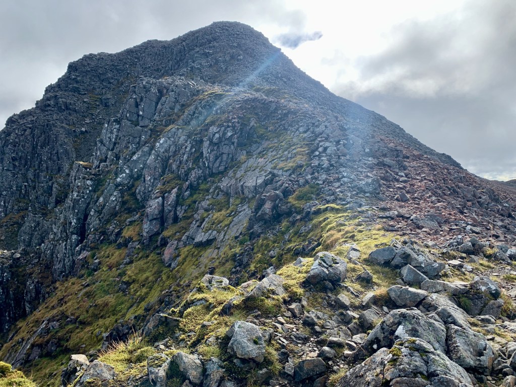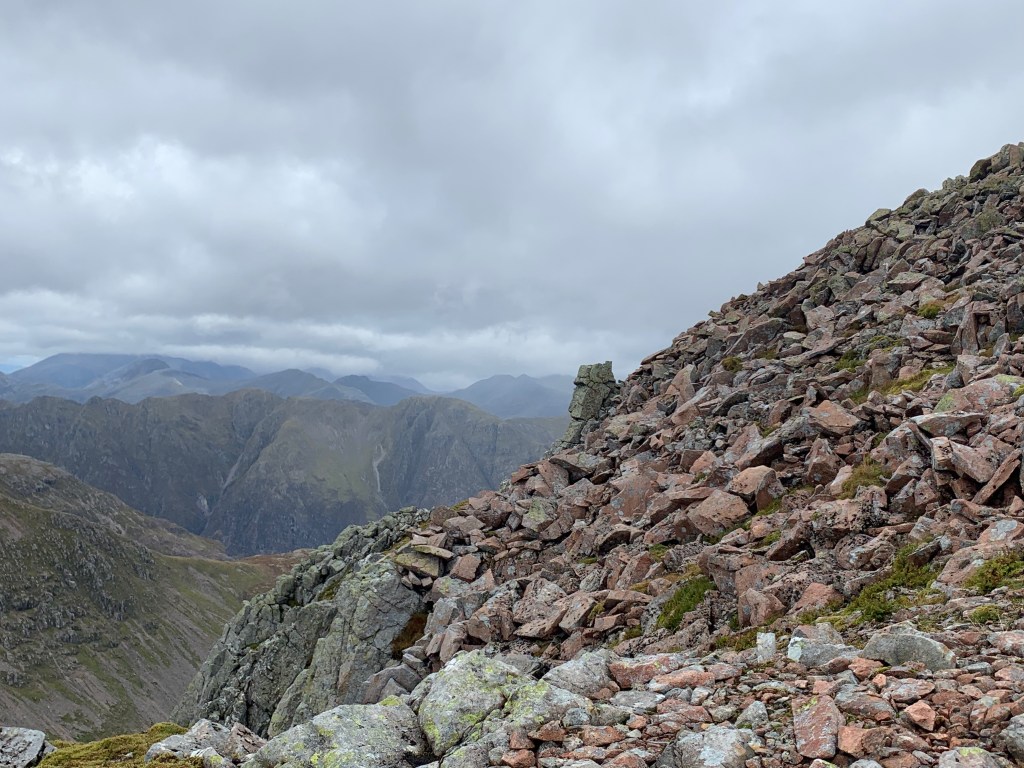 A cairn marked the start of the ridge up to Stob Coire nan Lochan. I will say, when you have climbed up above 900metres already – pretty much at the height of the smaller munros – and you reach the cairn marking the start of the path…it can be a little dispiriting!! But Stob Coire nan Lochan is fantastically rocky and spiky, and the route up is over an interesting boulderfield so I wasn’t complaining. Also the sun came out.