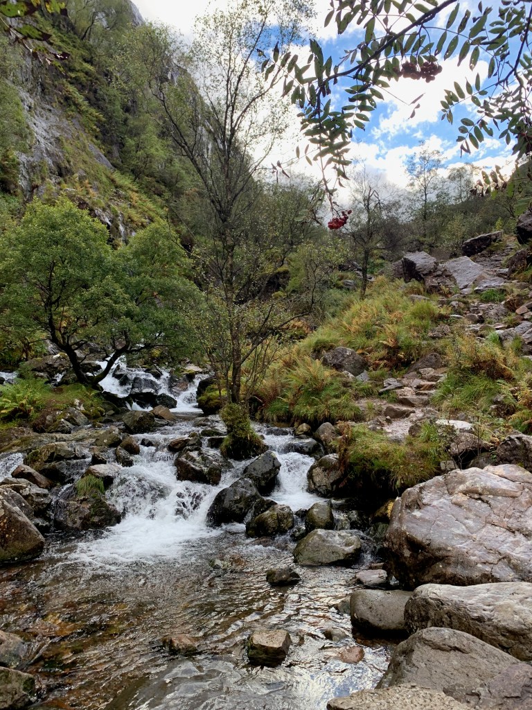 The route back down is through the lost valley, where the MacDonalds used to hide cattle they had rustled from nearby clans! The route down into the lost valley was down a steep and badly eroded scree chute, which was an interesting ride. The walk down from the lost valley back to the start point is through a beautiful gorge full of little waterfalls and clear rushing water.