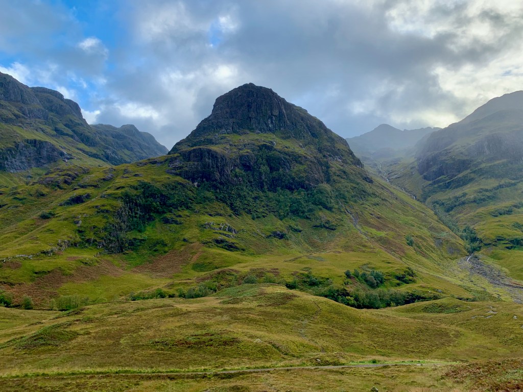 Glencoe is an amazing place. It’s one of Scotland’s most dramatic glens, both visually and in terms of its history. It was carved by glaciers which chiselled the ground and left behind these monstrous rocky behemoths of mountains. The way the sharp black rock juts out of the lush green topping feels to me like the bones sticking out of the earth, showing you what the mountains are made of. The local climate is typically misty and rainy so the drama is added to by waterfalls and deep corries that scar the landscape.