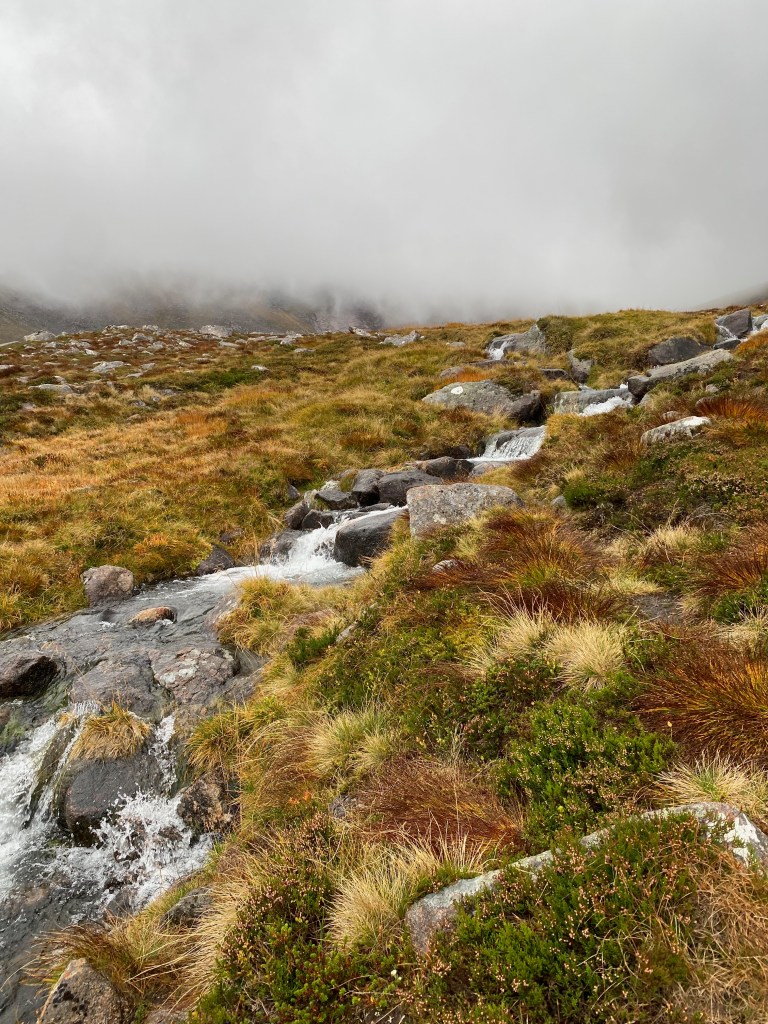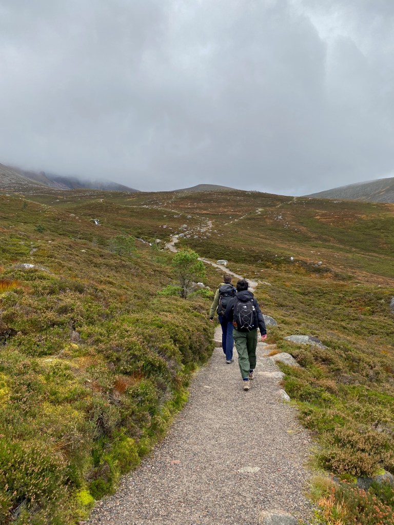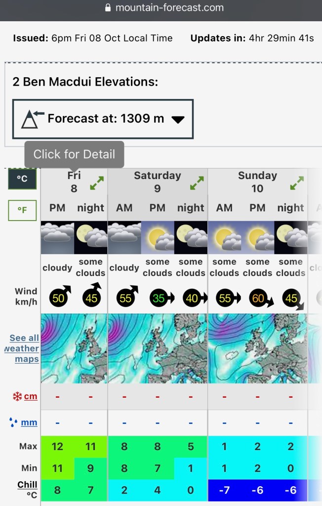 But the main walking event was our plan to conquer Ben Macdui and Cairngorm on the Saturday. Ben Macdui is the second highest mountain in Scotland at 1309m… but we did have a bit of a leg up since we started at the Cairngorm ski centre car park which sits at elevation of 635m. The forecast was for a windy, wet and misty mess in the morning, but some clouds/some sun in the afternoon. So we set off wrapped up but full of hope that the weather would get better as we got up the hill. I actually have evidence of the weather forecast lies this time since I screenshotted it the night before. See for yourself.
