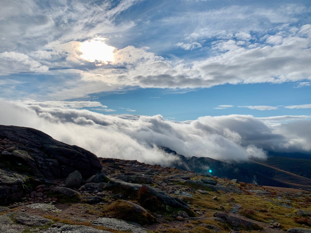 Funnily enough when the rain eased off, the air temperature wasn’t all that cold. So when we got to the top of Cairn Gorm a short while later and the sun came out.. it was almost warm?! The warmish breeze did a good job of drying off a fair bit of our gear too – bit like walking around in a tepid tumbledryer. Though without the tumble I suppose. Anyway the sun came out and Cairngorm opened up for us to see!!!