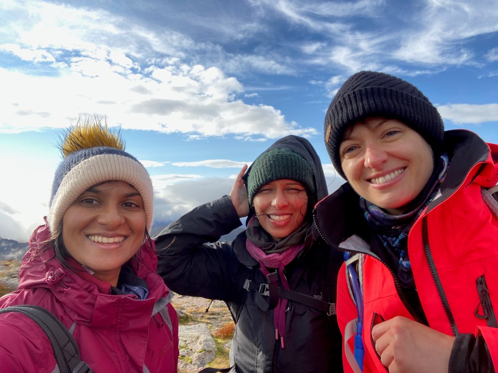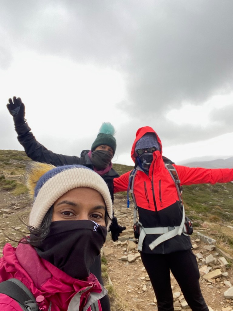 We followed the edge of the corries round, veering off our route slightly because the massive cairn up ahead looked really cool. My map tells me this was Fiacaill a’ Choire Chais but pease don’t ask me to say that out loud. And just as we got there… the clouds parted and gave us a view!! Surprise!! We were disproportionately excited to see this after the weather we’d walked through, and taking snap after snap on our phones with our cold fingers.