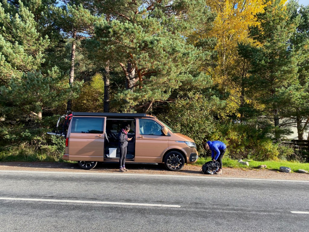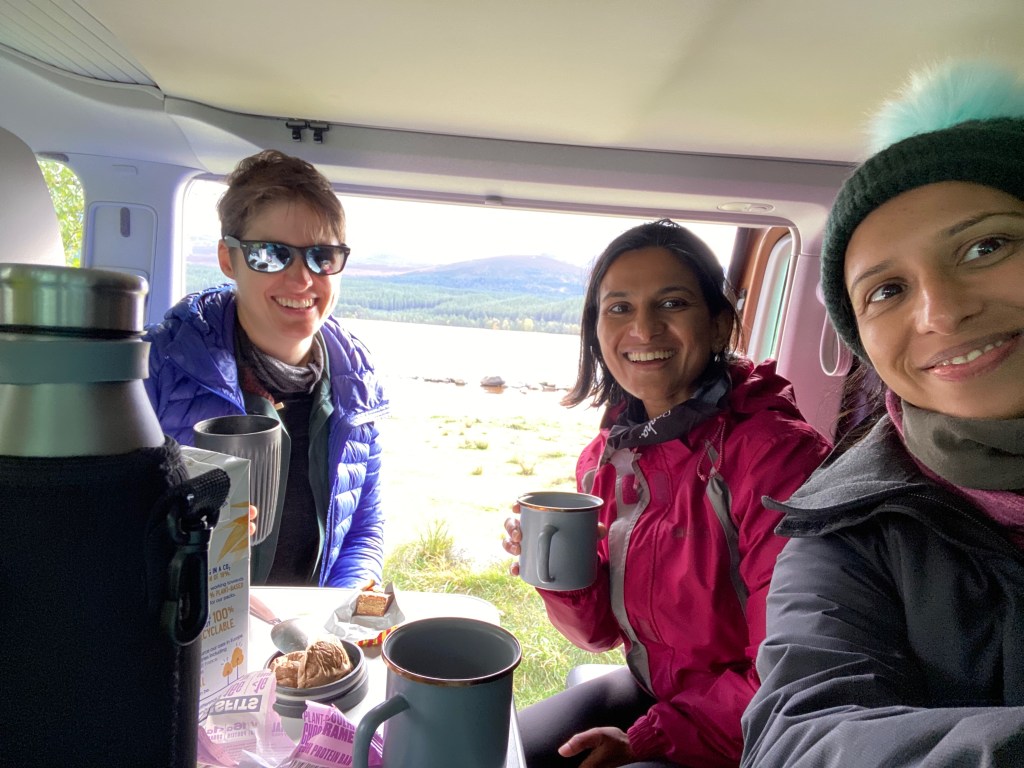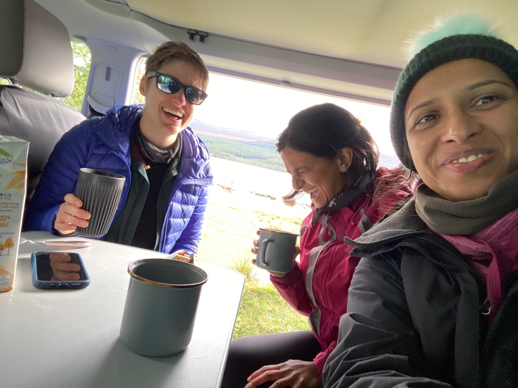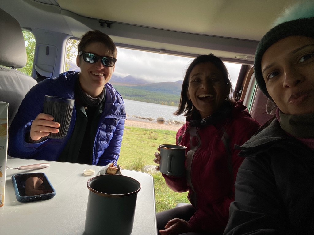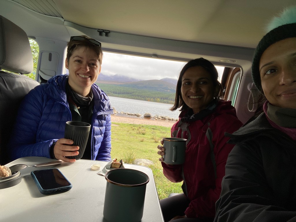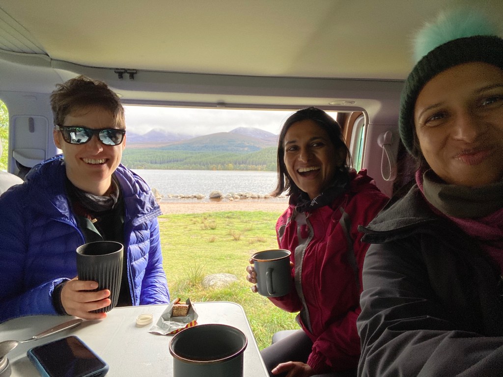Once we got back down we pulled up along the edge of Loch Morlich and brewed up some tea so Tash and Udani could have a tiny taste of vanlife. And Udani got a masterclass in selfie taking.