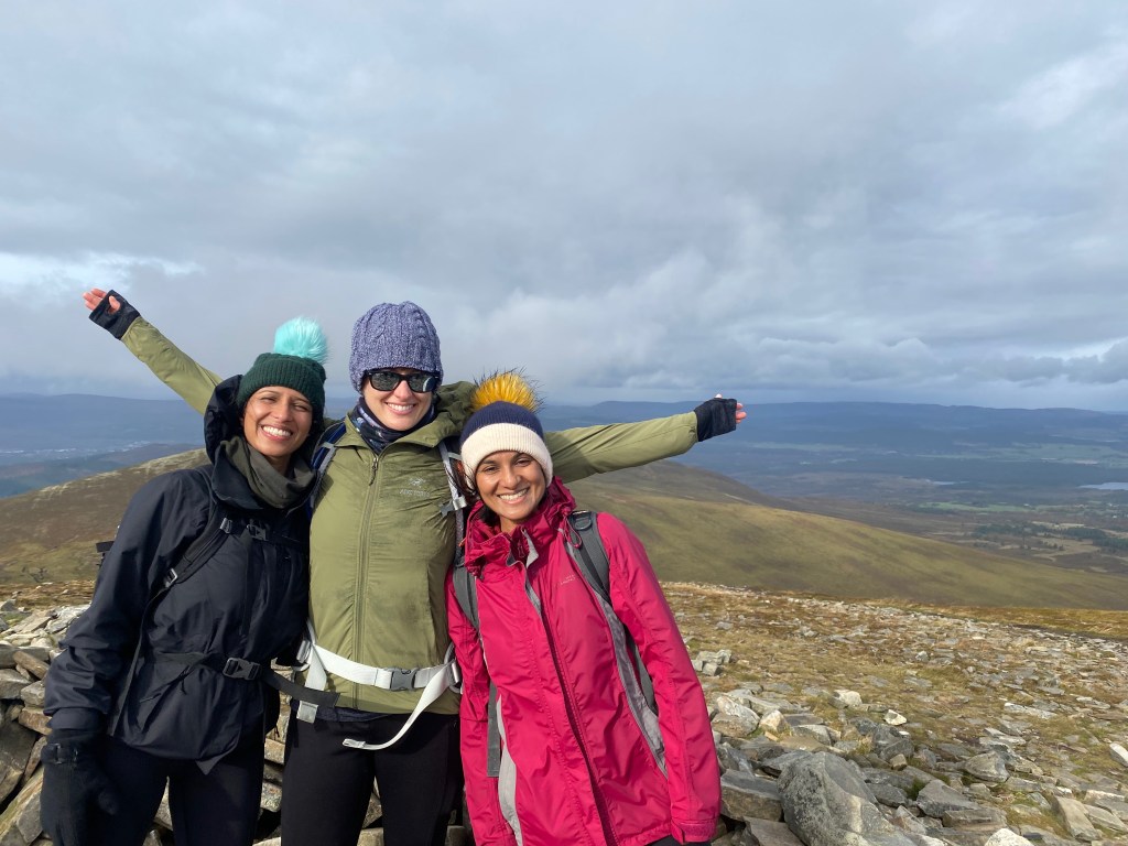 The next day we woke up to sunnier skies and took a walk up past Lochan Uaine – the green loch – and up and over Meall a’ Bhuachaille. The sunny day lured us up to a very windy top.