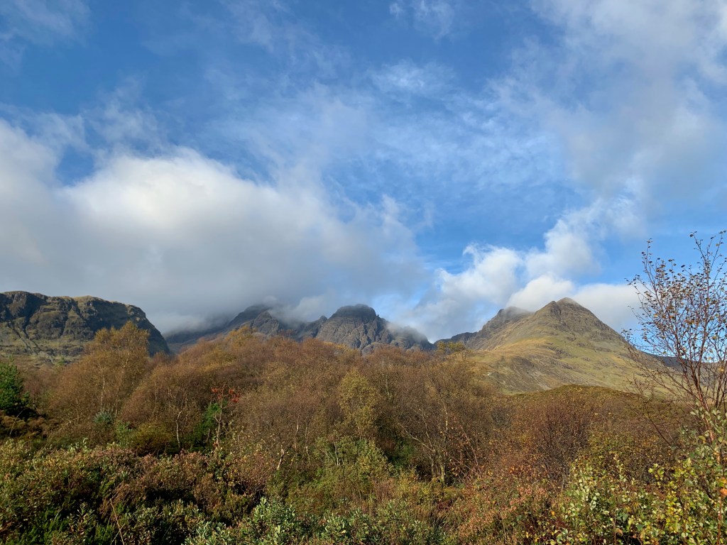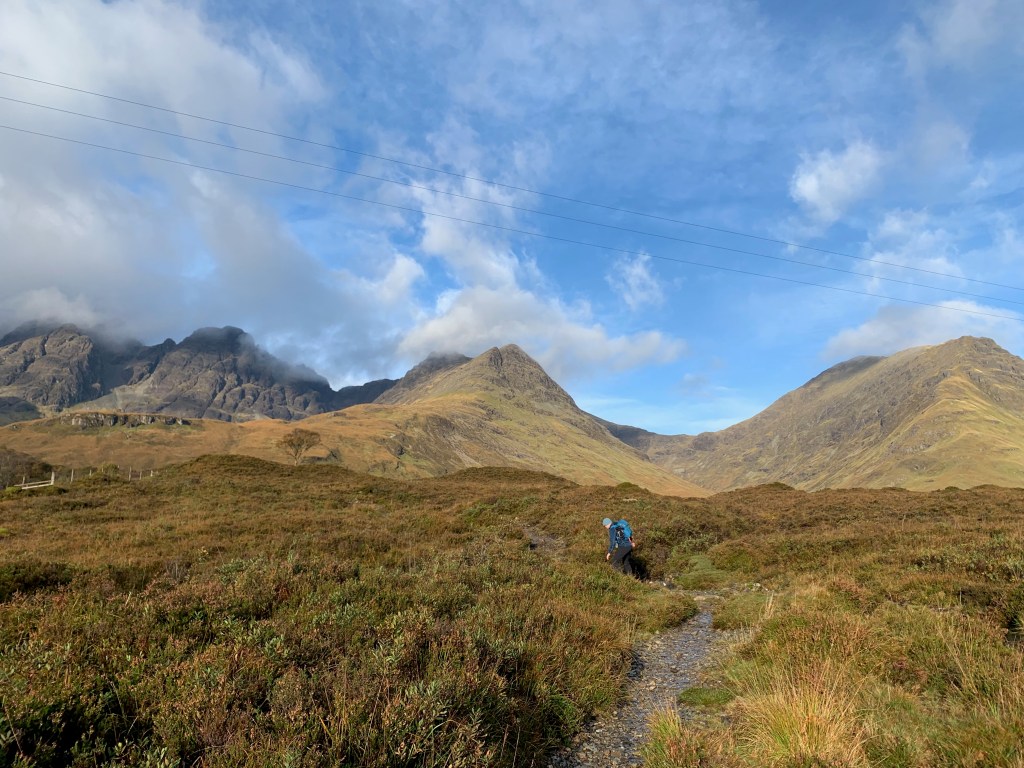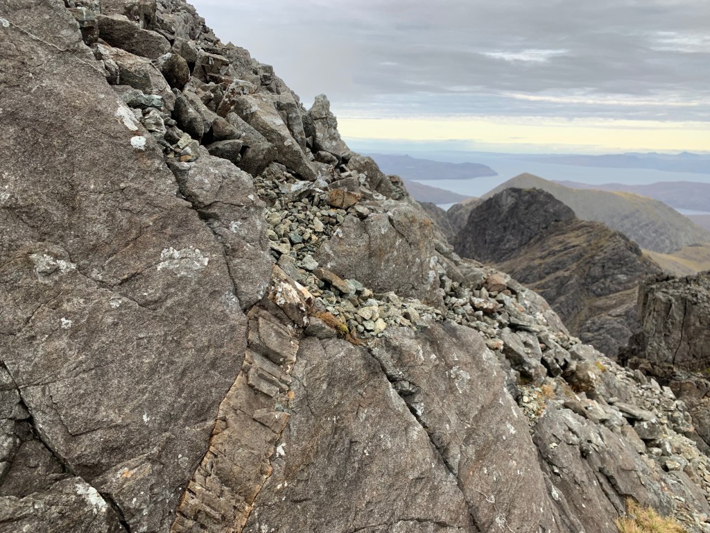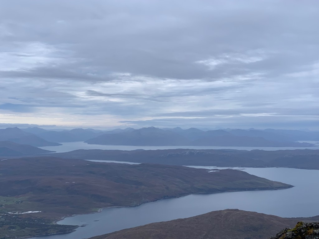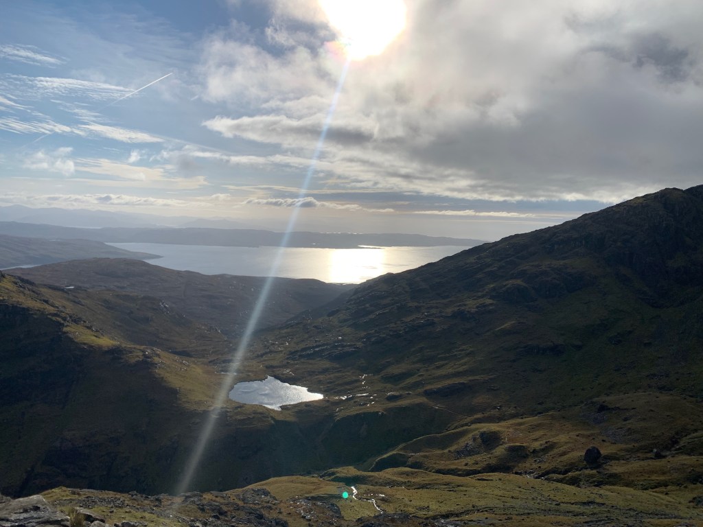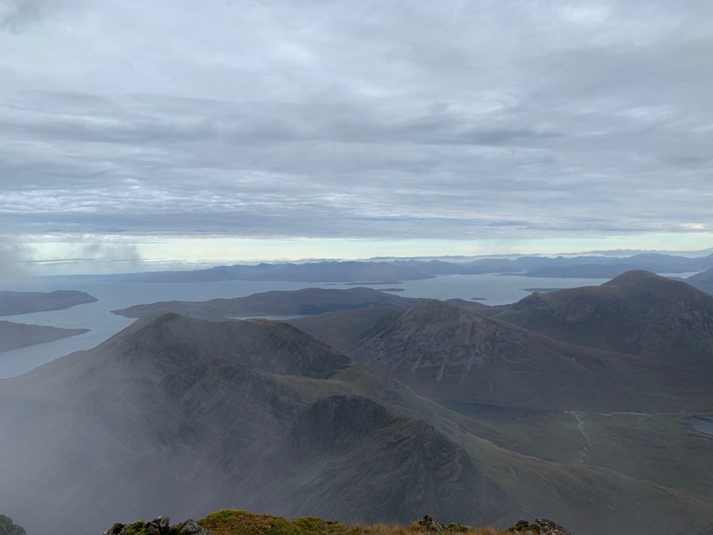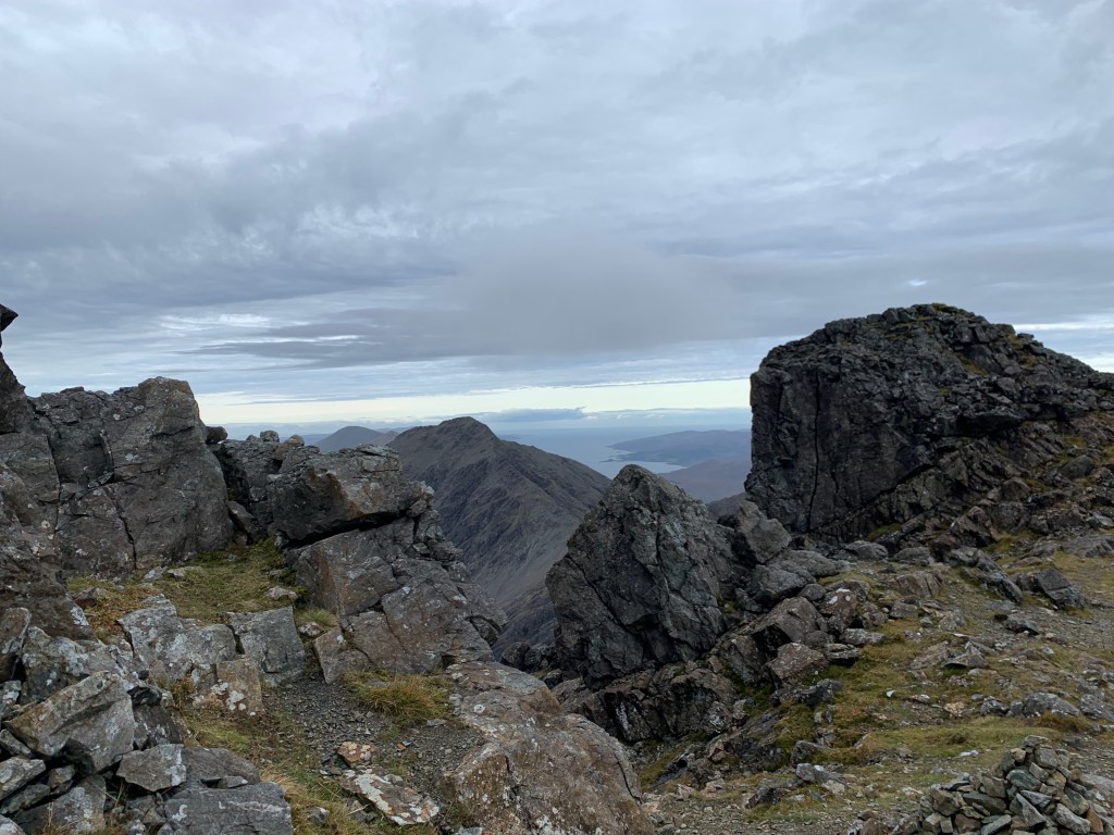 As we got to the top the clouds were thickening again. Gaah. But we stuck it out again since they were moving, and we got some glimpses of the Cuillin, though a bit like looking at the Black Cuillin through frosted glass. I’m afraid the picture is underwhelming, but it was SO EXCITING to get a wee look at this! The views out to the West Coast continued to brighten, and weren’t that shite after all.