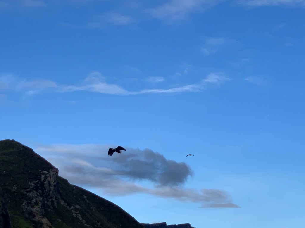 We got great views of a pair of sea eagles that nest in the area. Absolutely stunning creatures, with a massive 2m wingspan. One of them is an eagle that was reared and released from Fife, as part of a programme to reintroduce Sea Eagles to Scotland. She flew up to Skye upon her release and has established a territory there with a mate. She’s now affectionately known to the locals as Fifey. They’re obviously pretty tricky to capture on camera, but these were the best pics when one had a fly around bothered by a seagull.