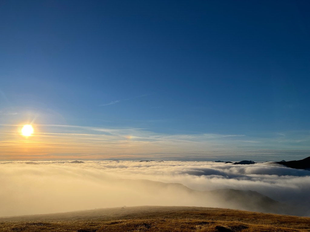 FULL INVERSION!! My first proper inversion since I came up here. We could see for miles and miles, with just the tops of the highest hills poking through the cloud. We stopped for a while drinking this in, enjoying the sun. A few guys we met said they’d been at this top for a couple of hours, struggling to see a reason to go down.